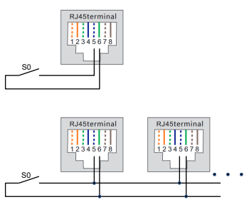 Some three-phase grid-feed inverters in the 80kW to 110kW range have two DRM ports. If multiple such devices are present in a PV system, the inverters can be interconnected using patch cables. The first inverter is connected as described below, and for all other inverters, the connection is made in parallel as outlined.