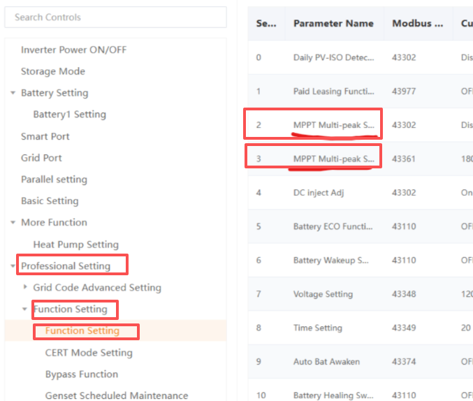 Inverter Control → Professional Settings → Function Settings → MPPT Multi-Peak Scanning