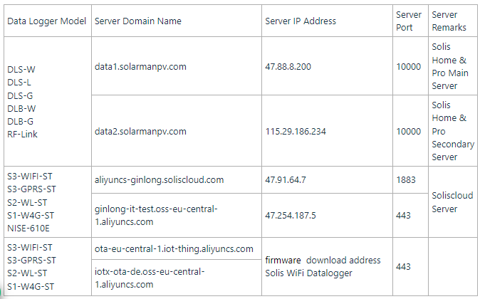 Informations serveur du data logger Solis – exceptions de pare-feu