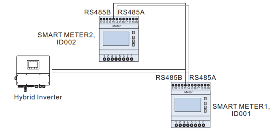 - I due meter devono avere indirizzi Modbus univoci per evitare conflitti di comunicazione.