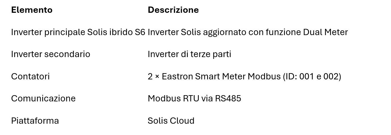 Entrambi i contatori comunicano con l’inverter Solis principale tramite protocollo Modbus RTU (RS485), permettendo alla piattaforma Solis Cloud di visualizzare i dati combinati di consumo e produzione.